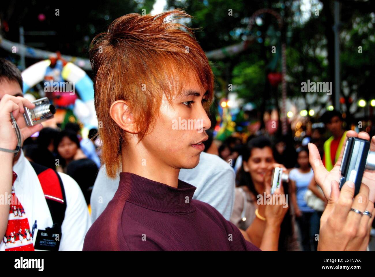 Singapore Young Asian Man With Dyed Reddish Hair Taking A Photo Of The Christmas Festivities On Orchard Road Stock Photo Alamy
